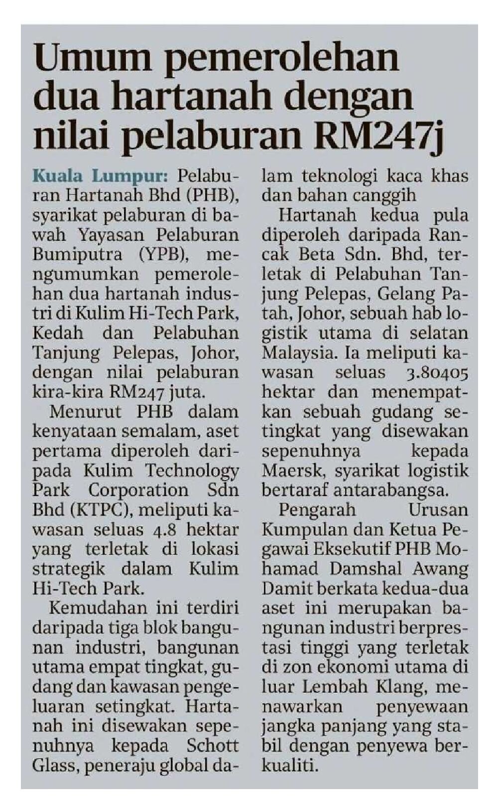 Harian Metro - Umum pemerolehan dua hartanah dengan nilai pelaburan RM247j