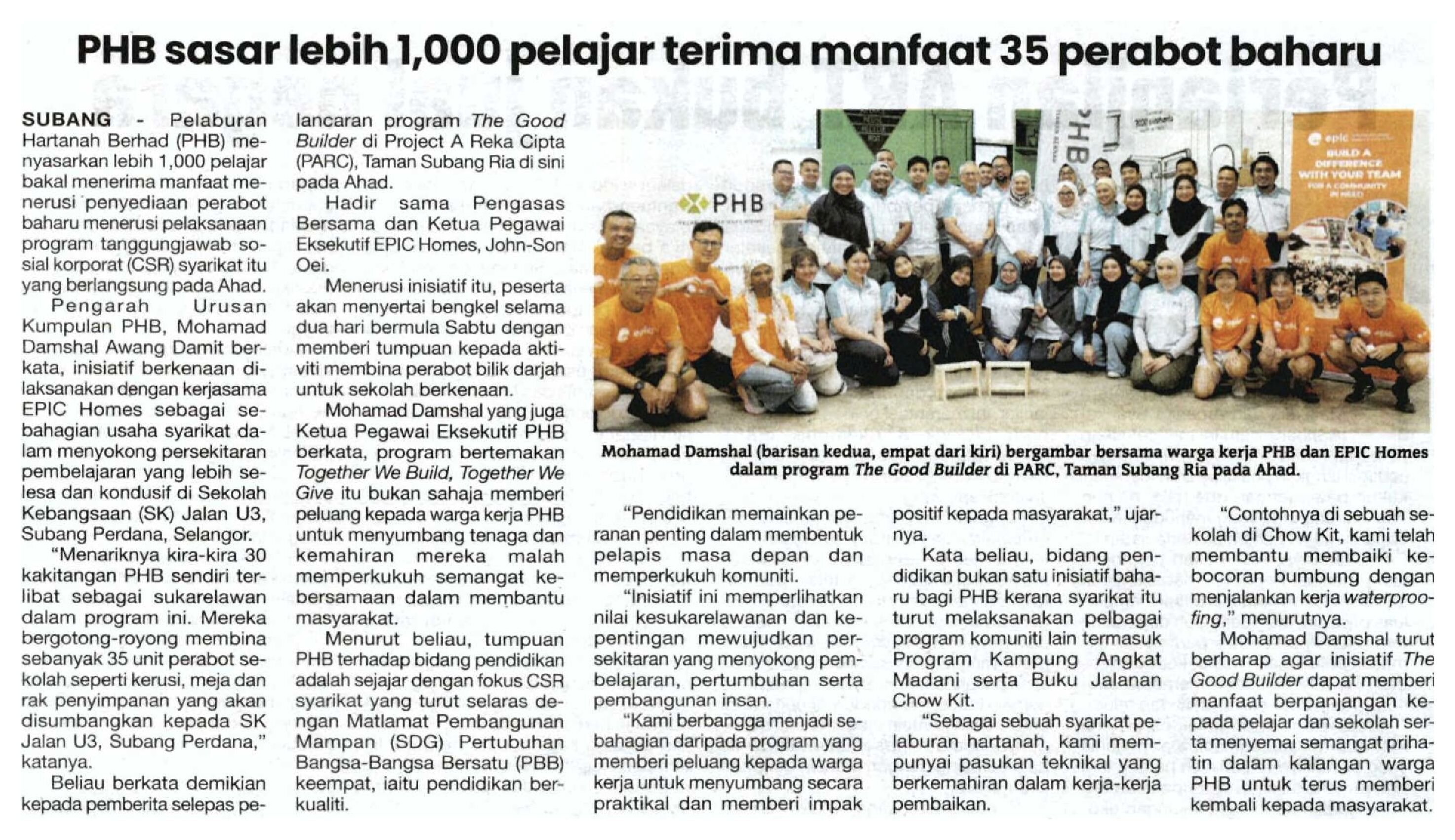 Sinar Harian - PHB sasar lebih 1,000 pelajar terima manfaat 35 perabot baharu