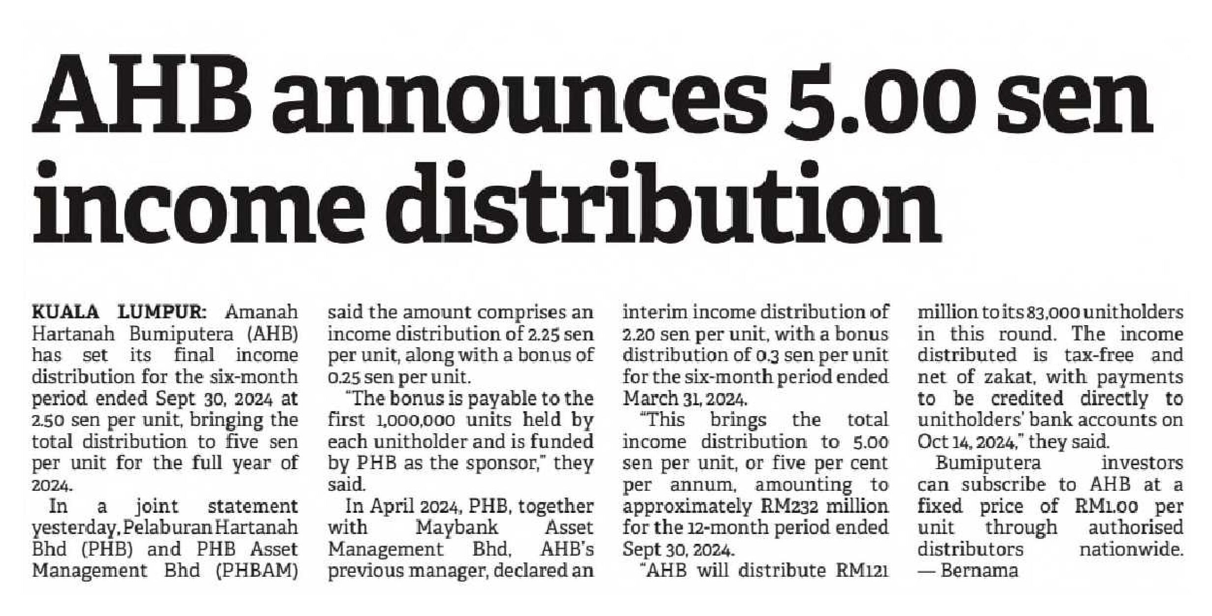 The Borneo Post Sabah - AHB announces 5.00 sen income distribution