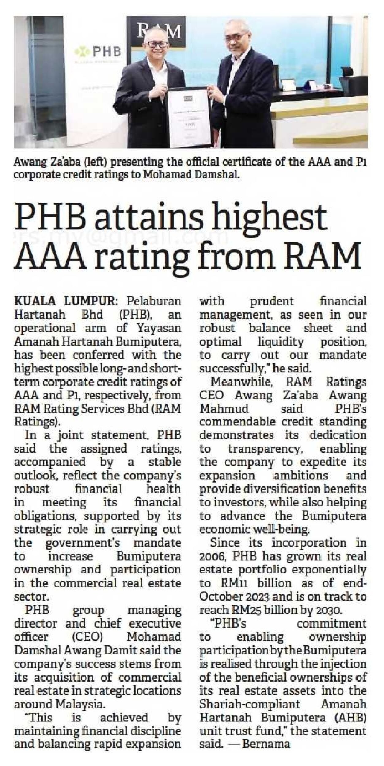 The Borneo Post Sabah - PHB attains highest AAA rating from RAM