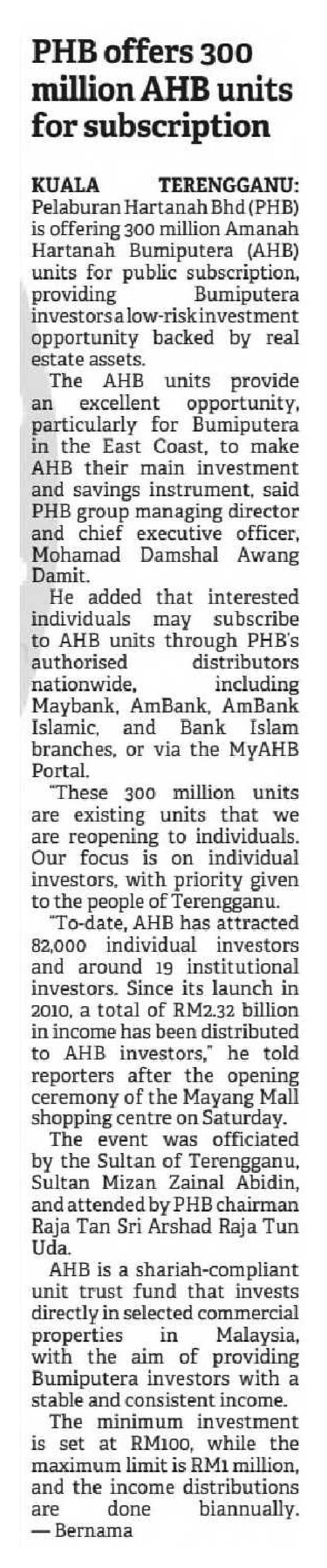 The Borneo Post Sabah - PHB offers 300 million AHB units for subscription