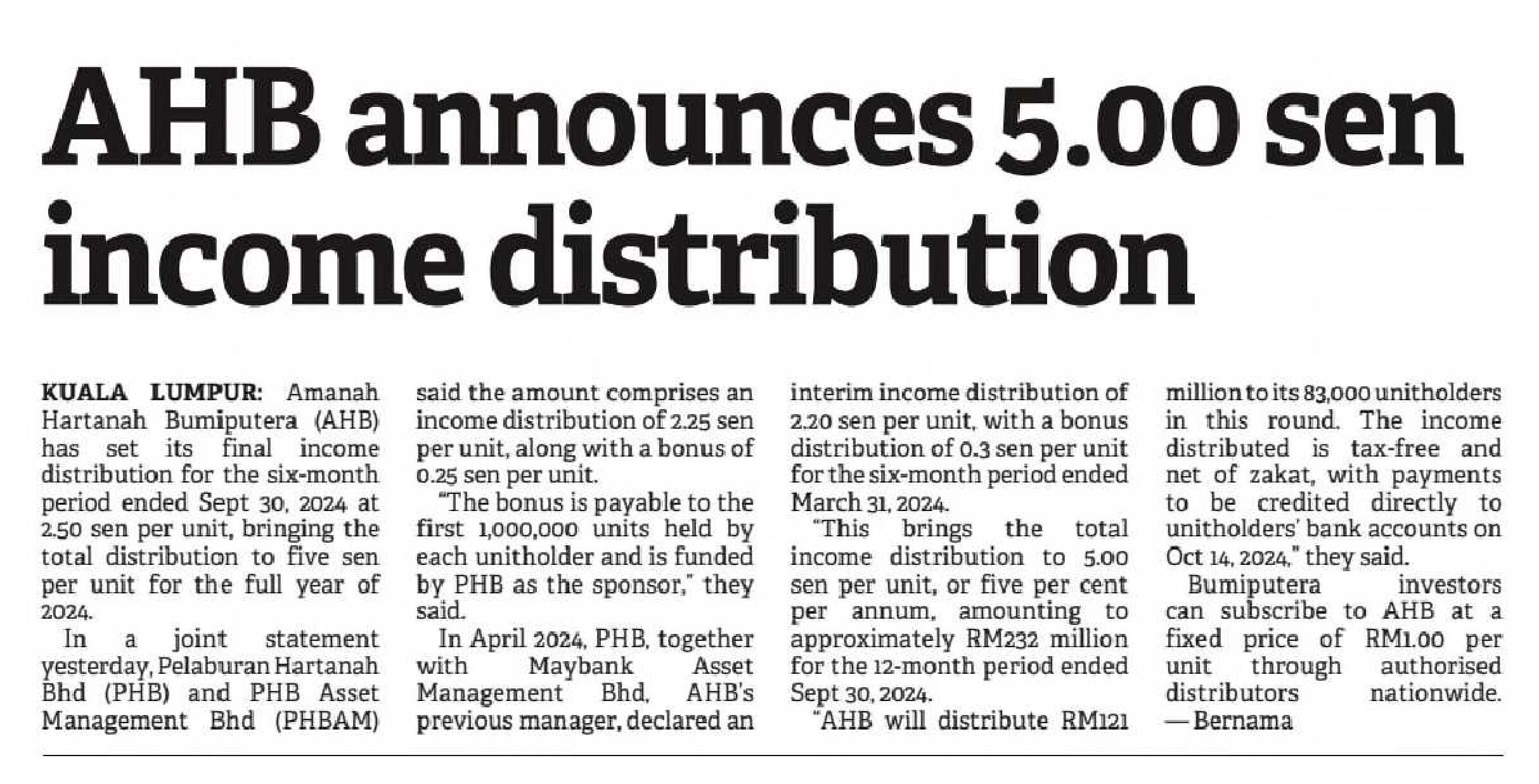 The Borneo Post Sarawak - AHB announces 5.00 sen income distribution