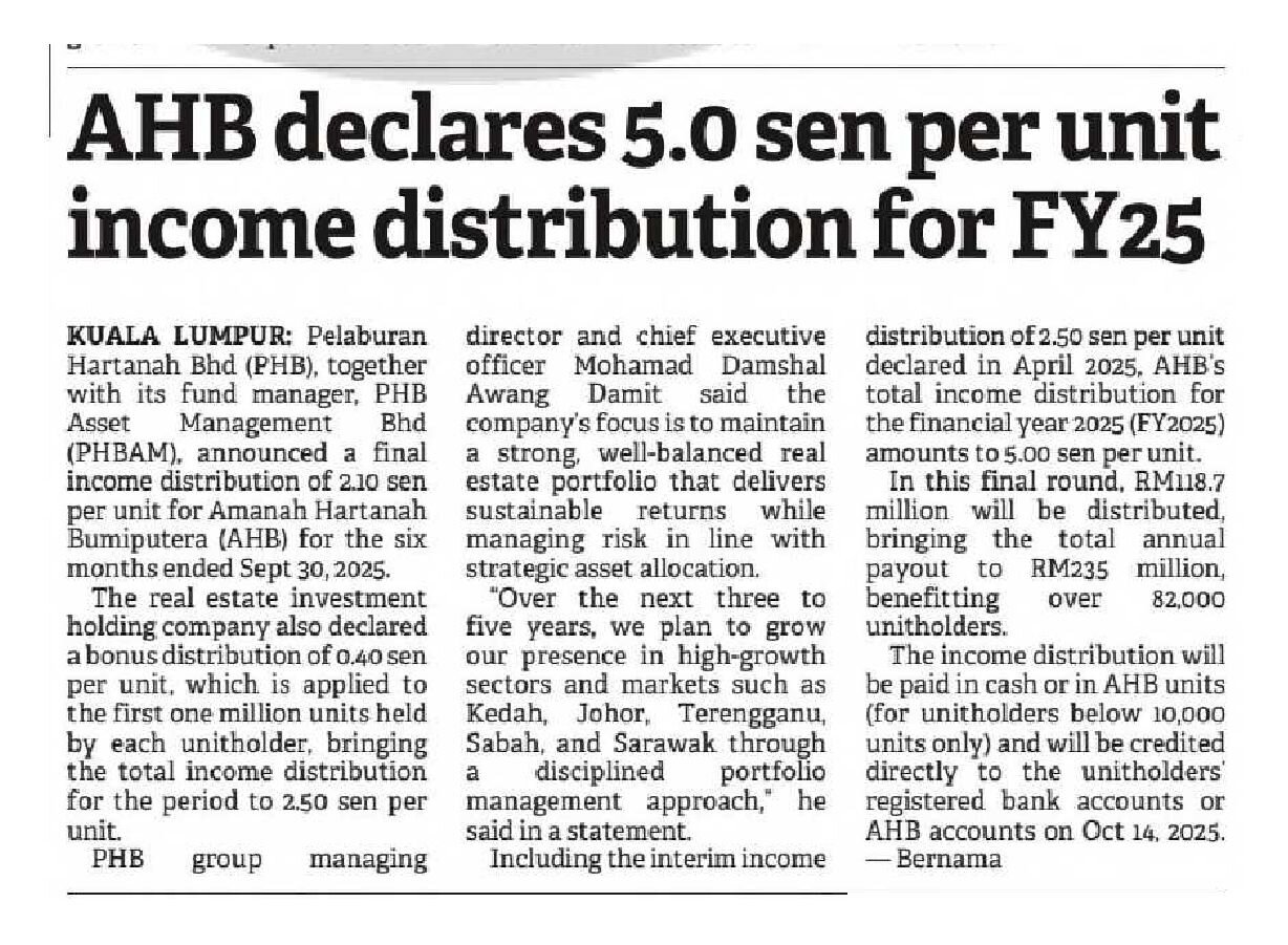 The Borneo Post Sarawak - AHB declares 5-0 sen per unit income distribution for FY25