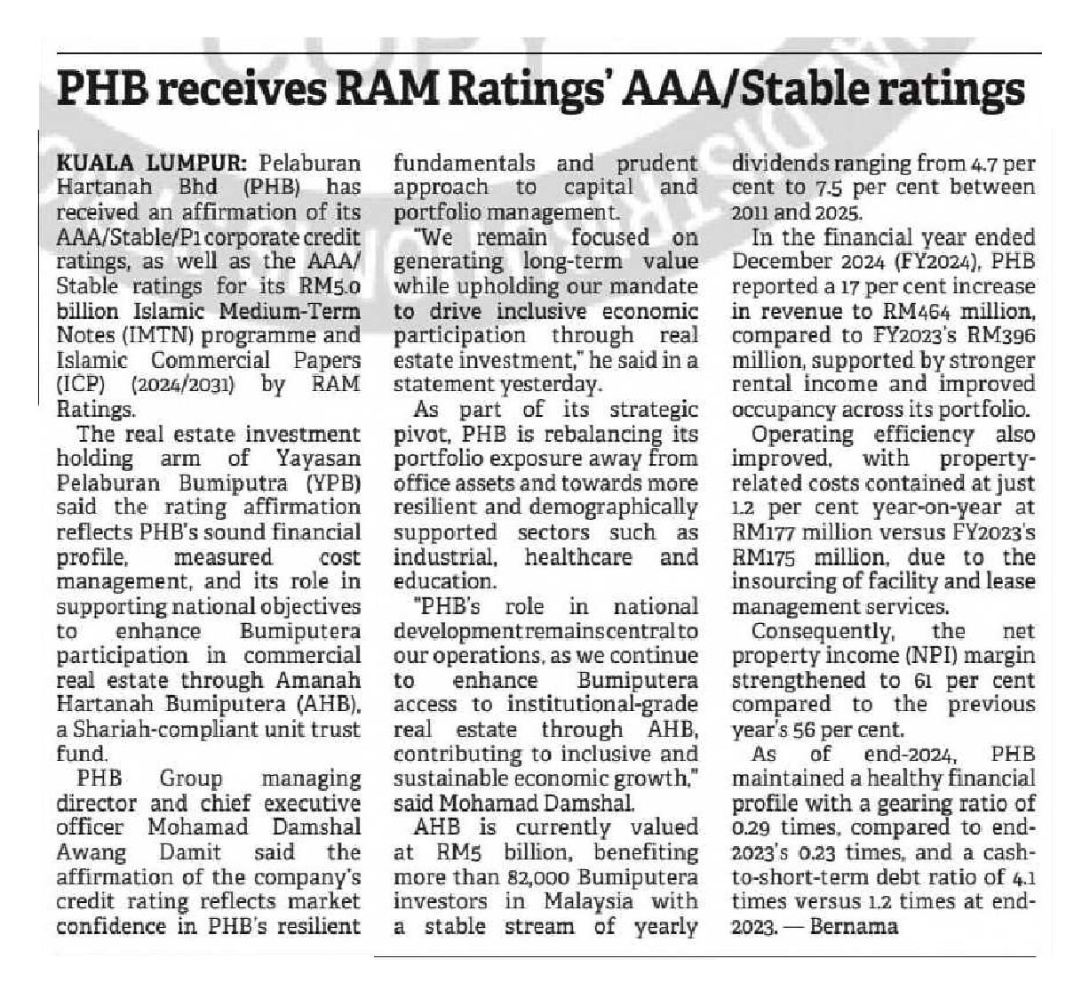 The Borneo Post Sarawak - PHB receives RAM Ratings' AAA/Stable ratings