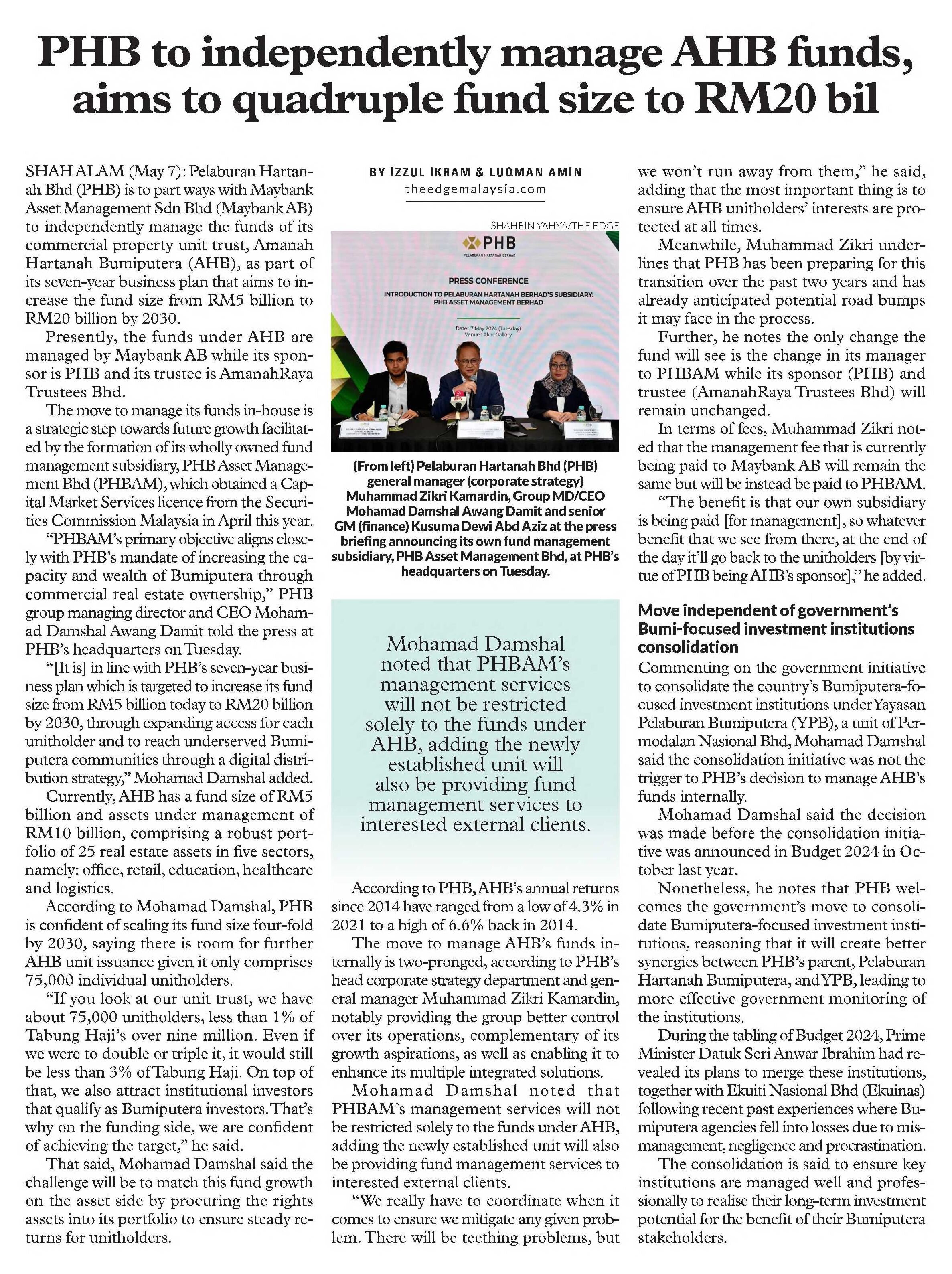 The Edge CEO Morning Brief - PHB to independently manage AHB funds, aims to quadruple fund size to RM20 bil