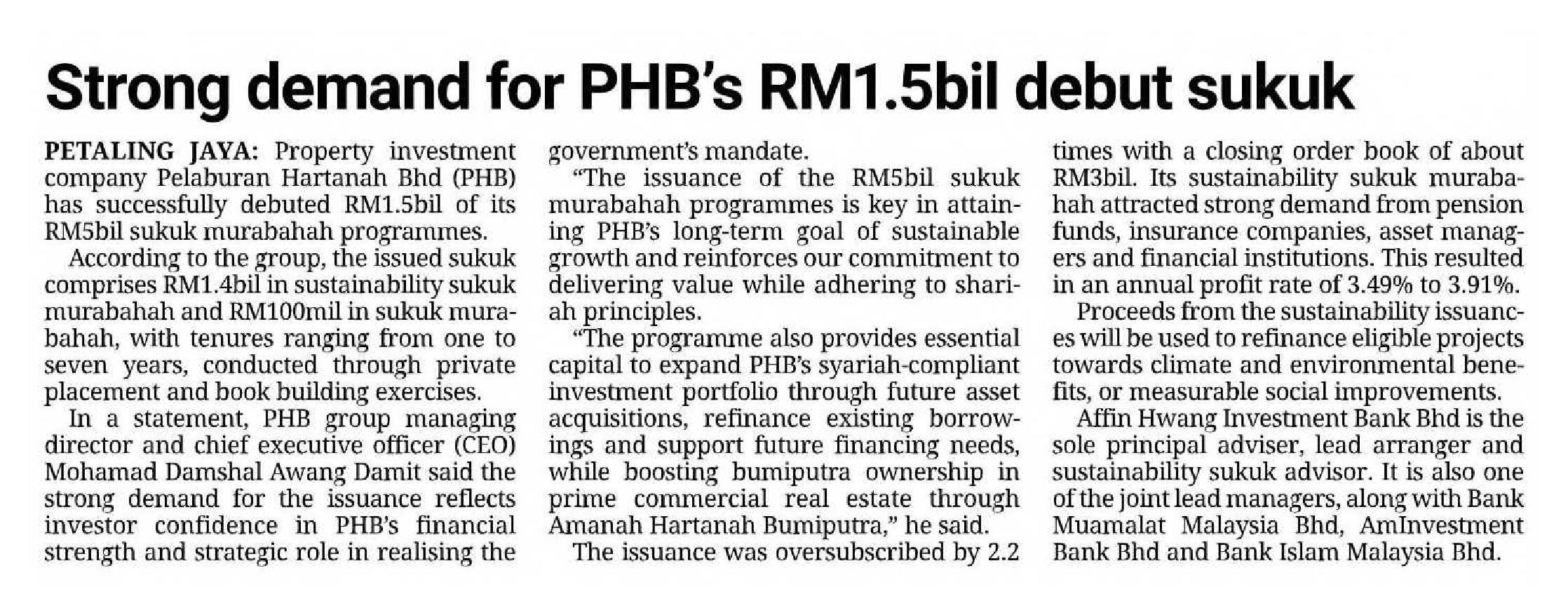 The Star - Strong demand for PHB's RM1.5bil debut sukuk