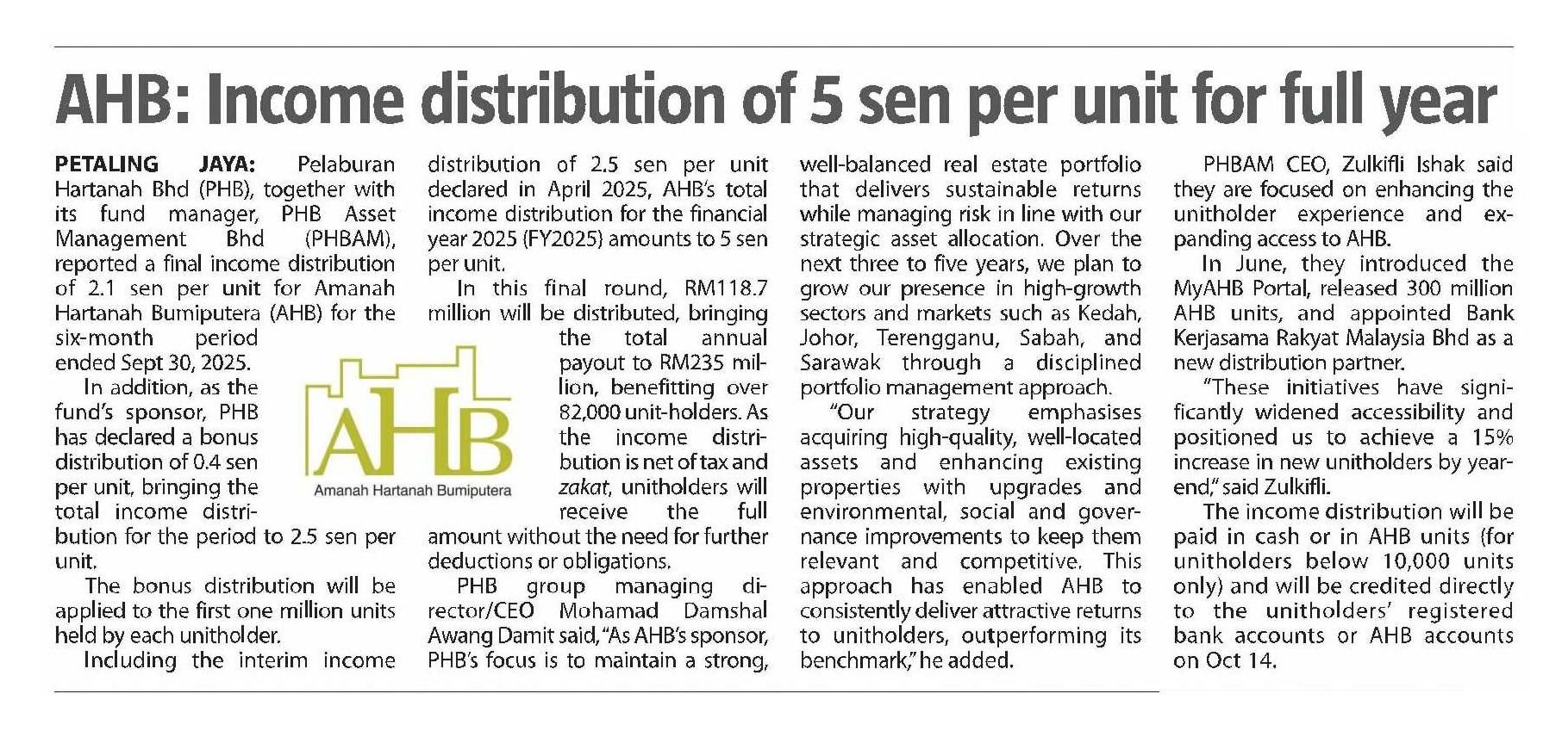 The Sun - AHB: Income distribution of 5 sen per unit for full year